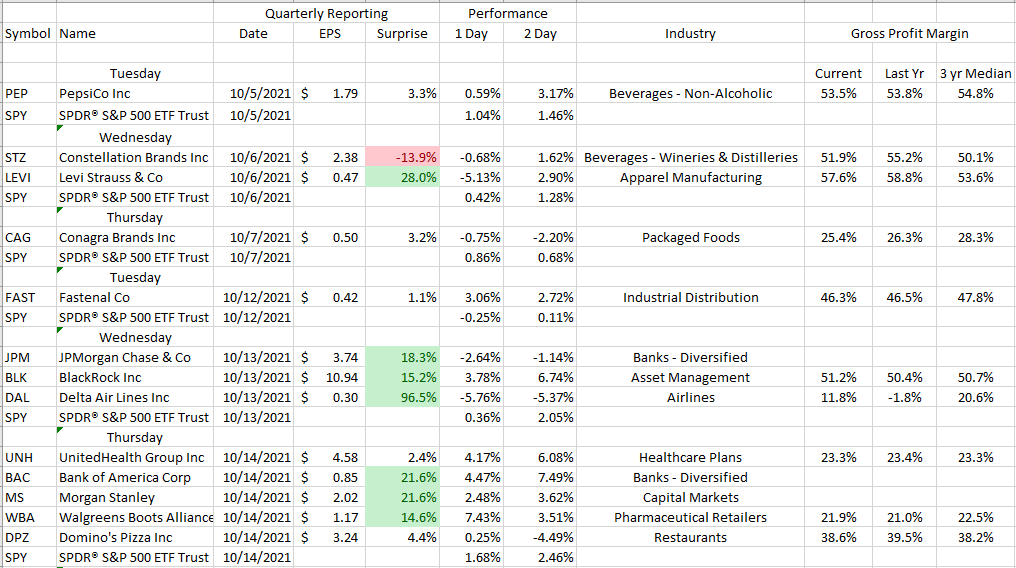 Starting this week and for the next few, we'll be including a listing of companies reporting third-quarter results along with some (very) short-term performance data to gauge how surprised investors were by the report. I've also added some gross profit percentages (sales - cost of goods sold/sales) in an attempt to measure the impact of inflation on results. A stable or (better yet) rising gross profit margin suggests the company is able to pass along some, if not all, of the increased costs of their products or service. Conversely, a falling gross profit margin suggests inflation is having some negative impact on their business. And, I will try to highlight some of the more interesting reports in my commentary.