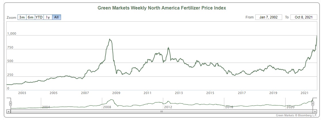Take a look at this chart of fertilizer prices at record highs. Can't be good for food prices...