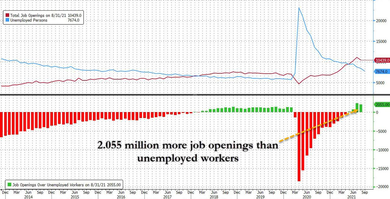 Finally, here's more evidence of the labor shortage that's having a widespread impact on our economy. The number of job openings exceeds the unemployed by more than 2 million! What gets people back to work? Higher wages (which ultimately results in higher inflation).