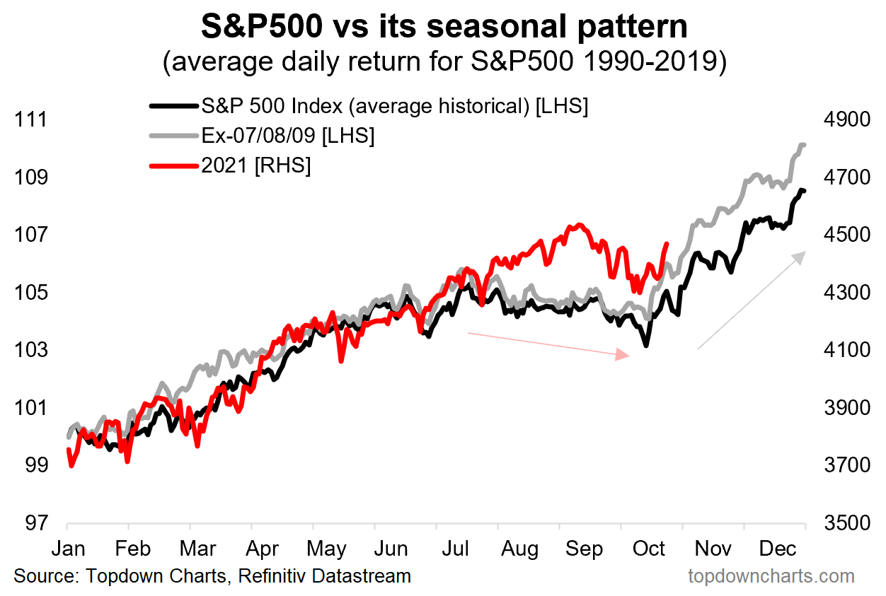 The S&P 500 is up 3.9% so far this October. That's still below its all-time high, but not by much. All of the momentum and cross-market indicators we follow in our Market Lab are once again suggesting further stock market upside potential. And as you can see from the graph below, the market has tended to rise in the fourth quarter...(Note that the gray line excludes the financial collapse years of 2007-2009.)