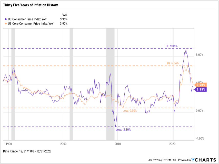 Today's inflation report has something for everyone. Both headline and core CPI gain 0.3% in December. Headline CPI was a bit higher than the hoped-for 0.2% while core CPI was about where everyone expected. For the last twelve months, headline CPI was 3.4% and core 3.9% both slightly higher than hoped but at least we got core CPI below 4%. What does all this mean? I don't expect interest rates to go meaningfully lower any time soon. Higher for longer...
