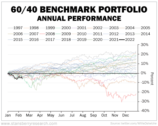 Many investors, individuals and institutions alike, utilize a portfolio strategy investing 60% in stocks and 40% in bonds. It has served them well providing solid long-term performance and less volatility than stocks alone. However, as you can see from this chart, the 60/40 portfolio is off to a rough start in 2022 (the black line).
