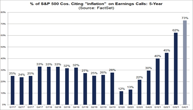 Over the past several quarters, more and more companies have cited inflation on their earnings call. Almost 75% have mentioned inflation in their fourth-quarter calls according to FactSet versus a more typical 25-30%.