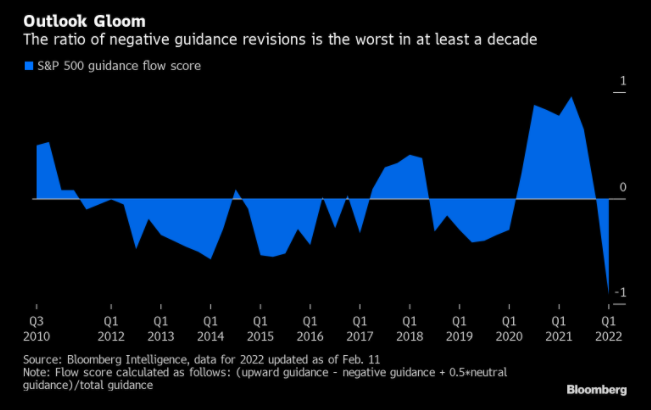 Why? Well, it's not the results that are the problem. What a company reported in the fourth quarter is history. It won't change unless there is a big accounting screw-up or fraud. What investors value is (in the main) the future. And what they have been hearing this quarter is a litany of issues from supply-chain bottlenecks to labor shortages that suggest the future, at least for the near term, is somewhat fraught. The result? Companies and Wall Street analysts are lowering their forecasts for future growth of revenues and earnings. Here's a chart, about a week old, which shows the ratio of companies raising versus lowering earnings forecasts at a 10+ year low.