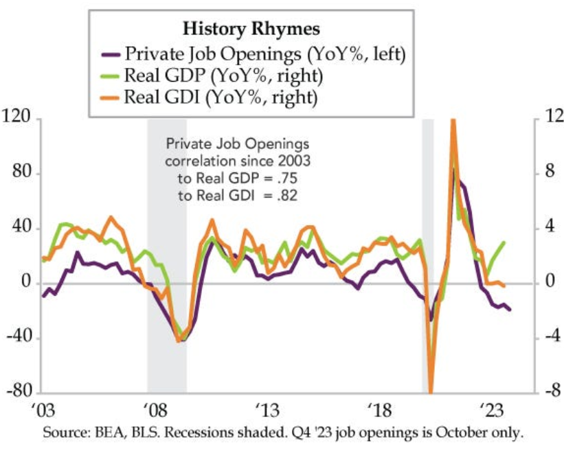 While the number of openings remains high and above the number of unemployed, the downward trend is of concern. Danielle DiMartino Booth published this chart, which at the very least raises questions about the health of the economy and the significant divergence between the GDP and other measures of the economy.