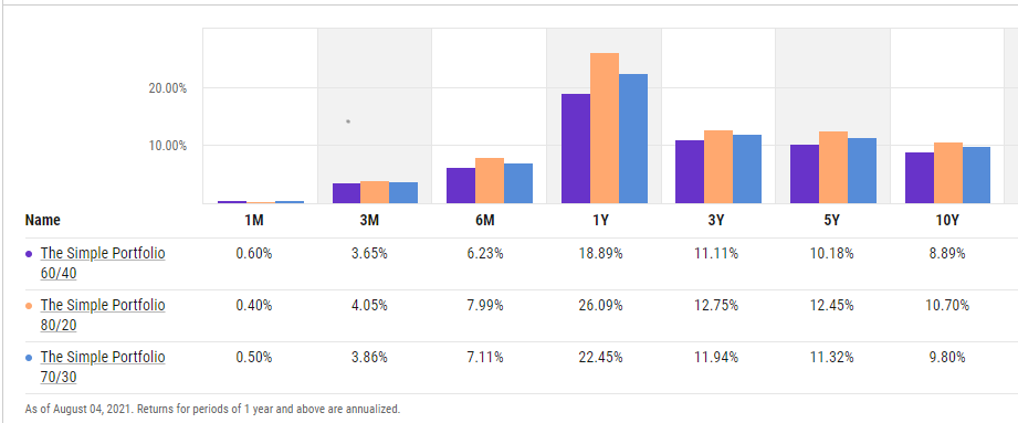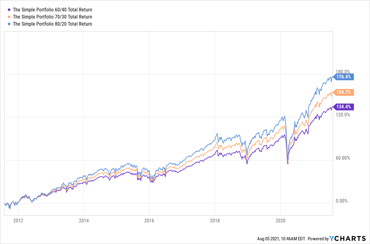 Stocks (US stocks, in particular) have done very well over the past 10 years. Portfolios more heavily invested in stocks have been significantly outperforming more conservatively managed portfolios as a result. So while not as risky thanks to being diversified, all three of the simple portfolios have lagged the S&P 500 during this bull market. Of course, that could change should stocks head into a bear market (not a prediction!).