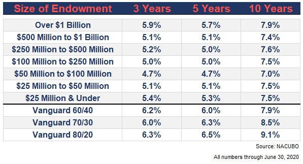 In a recent post on his blog, A Wealth of Common Sense, Ben Carlson displayed a table of returns from college and university endowments comparing them to a simple three-fund portfolio.