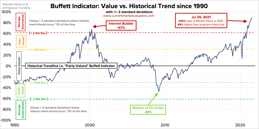 The Buffett Indicator (total market value to GDP) tells a different and perhaps alarming story of a stock market significantly overvalued.