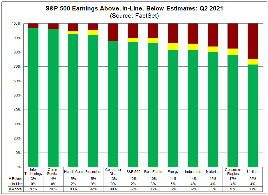 The bulk of the second-quarter earnings reports are now in and it was a tremendous quarter with more than 85% of the companies reporting results that exceeded forecast. Here's a breakdown by economic sector: