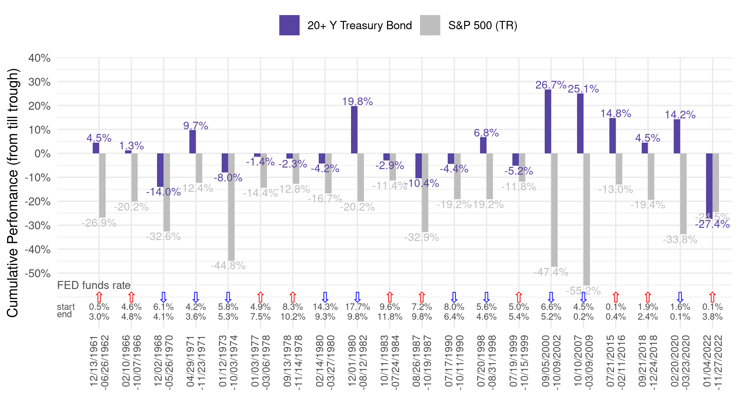In fact, 2022 was a very unusual year as both stocks and bonds suffered significant declines. Indeed, 20+ year treasuries declined more than 30% (!) last year, much worse than the stock market. The chart below looks at the returns of the S&P 500 and 20+ year U.S. Treasury bonds during periods when the Fed was either raising or lowering the Fed Funds rate. Take a moment to focus on the periods of rising rates identified by the little red arrows at the bottom of the chart.