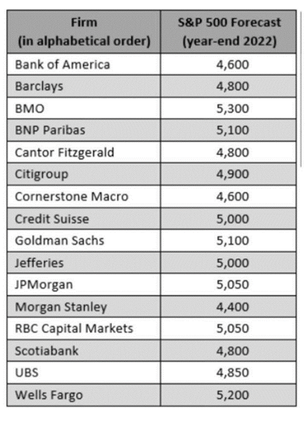 As you read this section remember, forecasts are usually wrong. Here, for example, is a table of stock market forecasts from late 2021 for year-end 2022 made by many of the top firms on Wall Street.