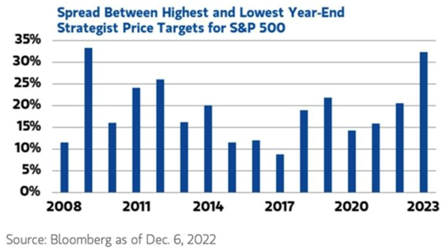 Today, the spread between the highest and lowest stock market forecast for 2023 is more than 30% suggesting these strategists and market analysts haven't got a clue about what might happen this year.