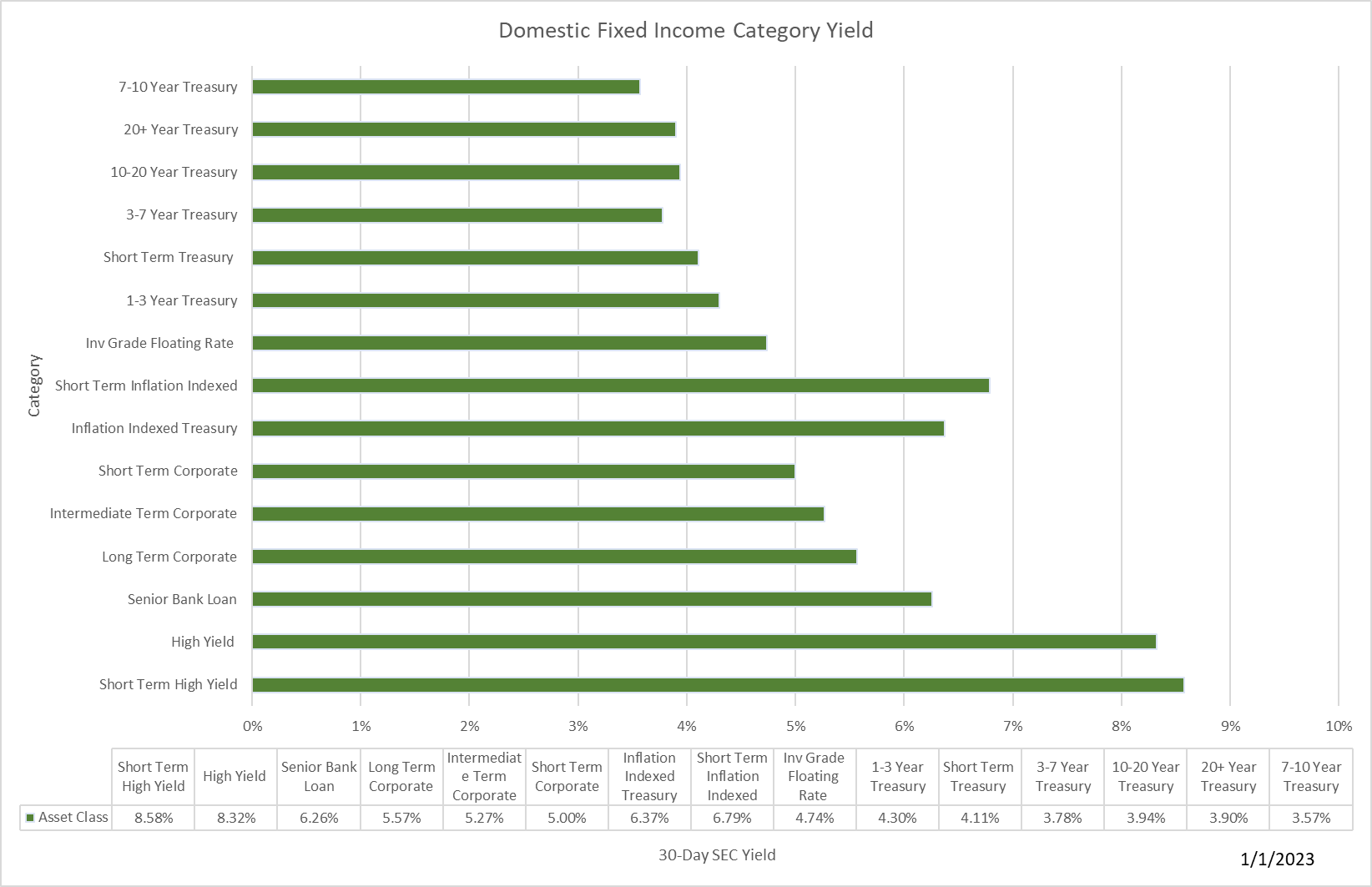 The silver lining of the Fed induced bond debacle is higher yields. This is great news for savers and investors. Below is a chart of current yields for various types of fixed income investments.