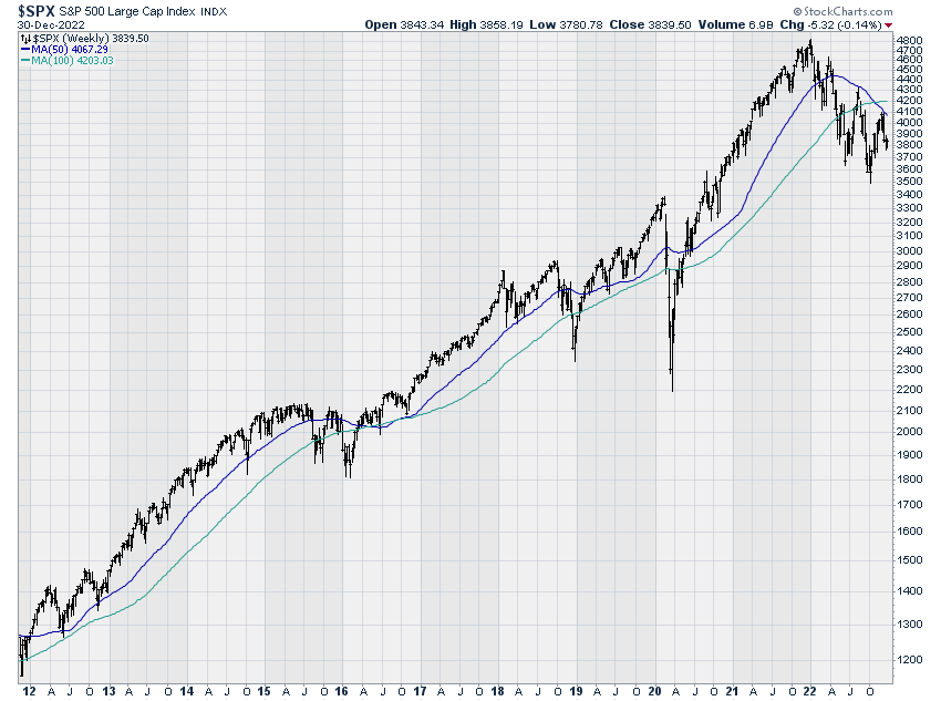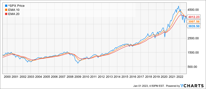 First, momentum remains bearish. The S&P 500 closed out 2022 at 3,840, below both the 10-month and 20-month exponential moving averages. Importantly, the shorter term moving average is now below the longer term moving average, a pattern seen in early 2001 and early 2008. In both those cases, we experienced deep, extended bear markets.