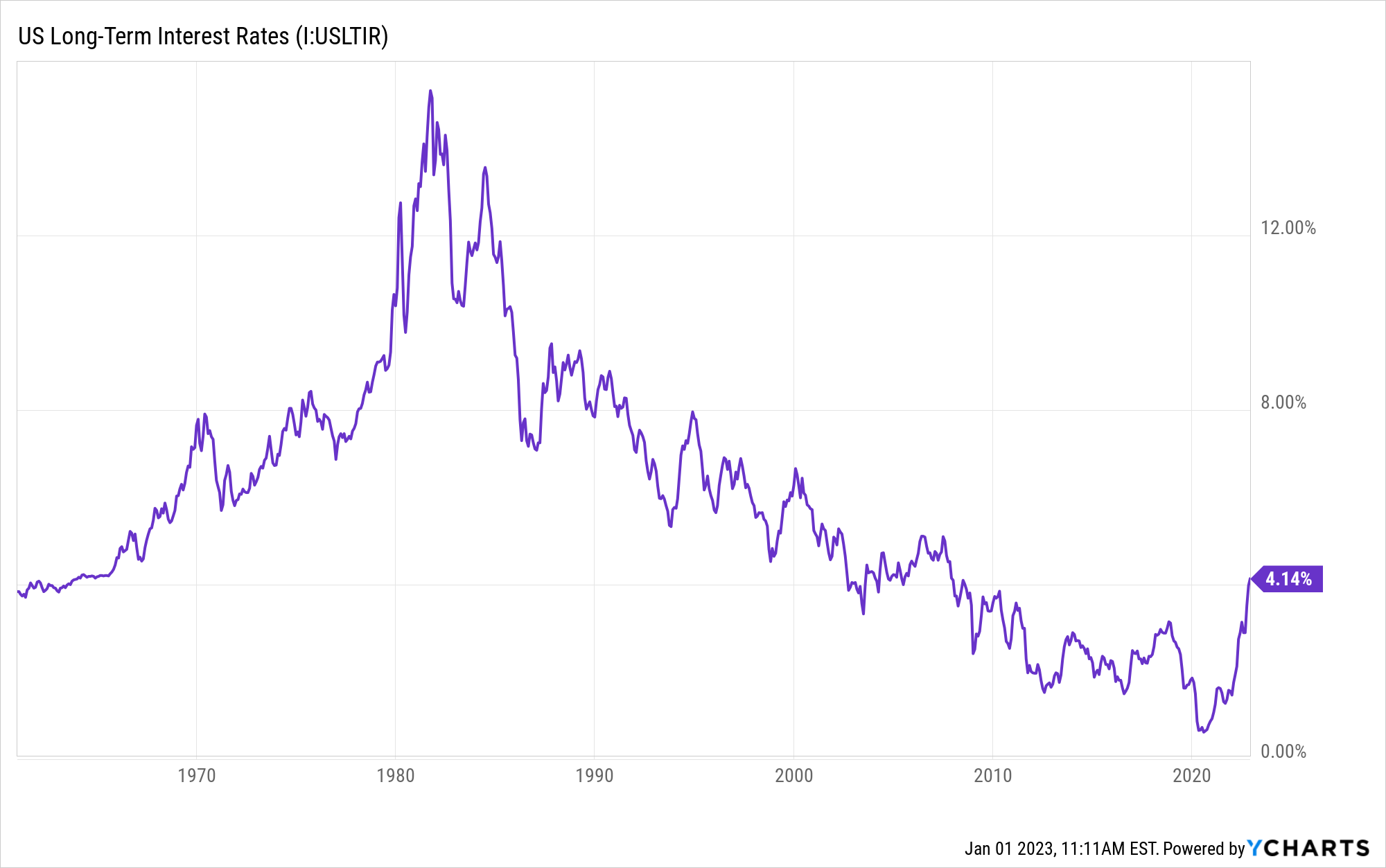 Why such a violent reaction in bonds? Remember that bond prices move inversely versus interest rates. The Federal Reserve was forced to aggressively hike short-term interest rates and take other measures to address accelerating inflation. As a result, long-term interest rates rose almost 600% (!) from a historically low rate of 0.60% in July 2020, to 4.14% today. Bond prices were crushed. Here's a 60-year history of those long-term rates:
