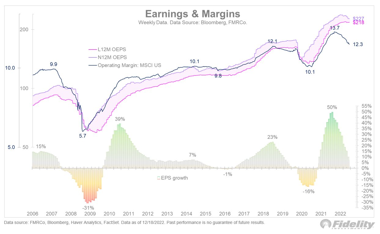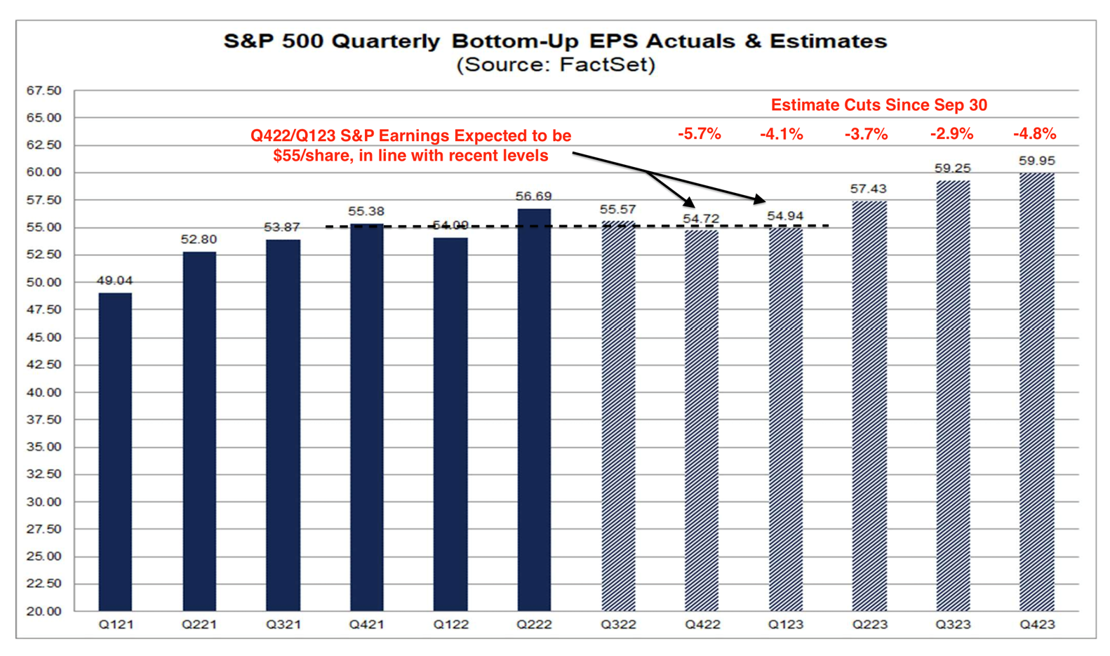As the market's P/E starts to stabilize, concern shifts to fundamentals. Simply put, it seems unlikely that corporate earnings will advance in 2023 given all the factors we have already discussed. Yet analysts have yet to meaningfully adjust their forecasts for 2023 earnings.