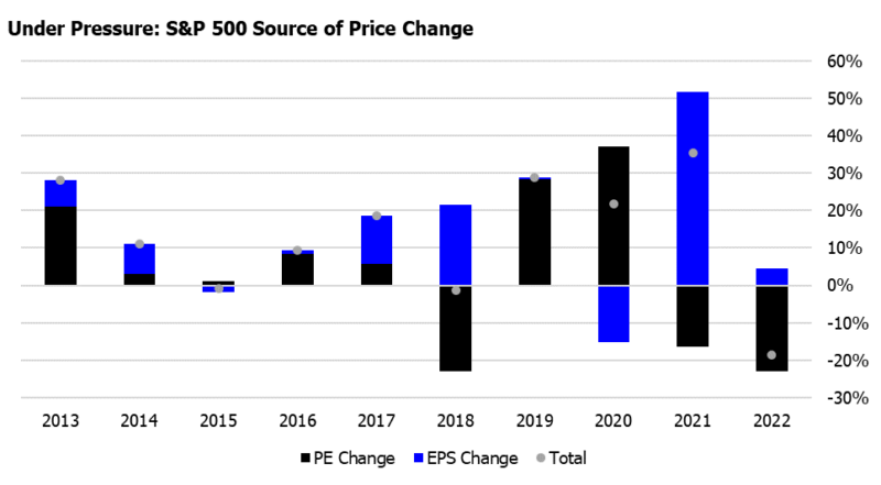 This second chart shows that despite rising earnings in 2022, stocks still fell as the P/E collapsed.