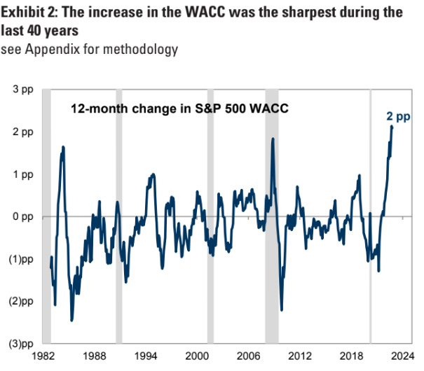 The cost of capital (the engine of growth) has risen sharply with the interest rate increases. Here is a chart of the weighted average cost of capital (WACC) for the S&P 500. It has risen about two percentage points recently and I doubt returns on that capital have gone up at all.