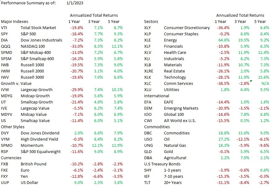 A new year begins! With it, investors partake in the annual ritual of reviewing their past year's performance and making forecasts for the future. I'm not a big fan of either. Performance reviews, while admittedly necessary, are tedious while even the best forecasts are likely to be wrong and if relied upon, may lead to less-than-desired results, However, despite my objections, let's start this year's ritual with a review of 2022.