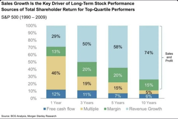 Here's an interesting chart from Invest In Assets originally published by Morgan Stanley showing sources of equity returns in both the short and long run for top-performing stocks. It's pretty clear long-term winners are driven by sales growth.