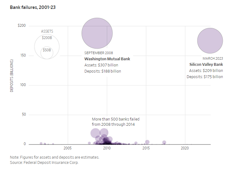 SVB was the 16th largest bank in the U.S. and the second largest failure after the collapse of Washington Mutual as this graphic from the Wall Street Journal shows.