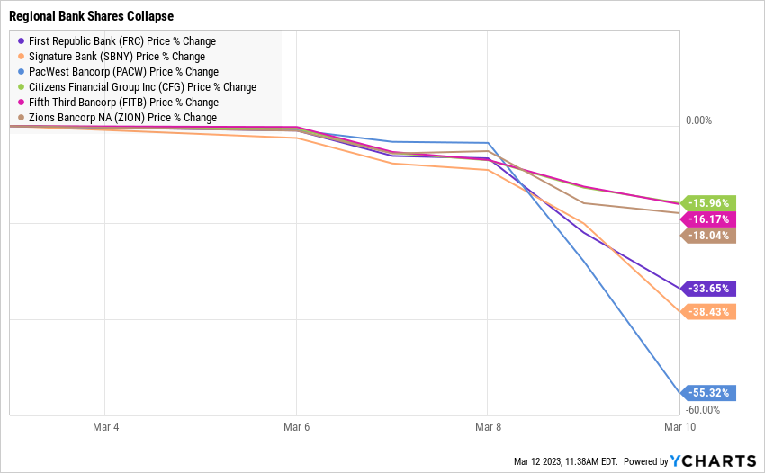 The SVB panic spread to the shares of other banks seemingly suffering from similar balance sheet issues. Here is the impact on share prices for a sampling of regional banks. (One of them is my bank, ugh!)