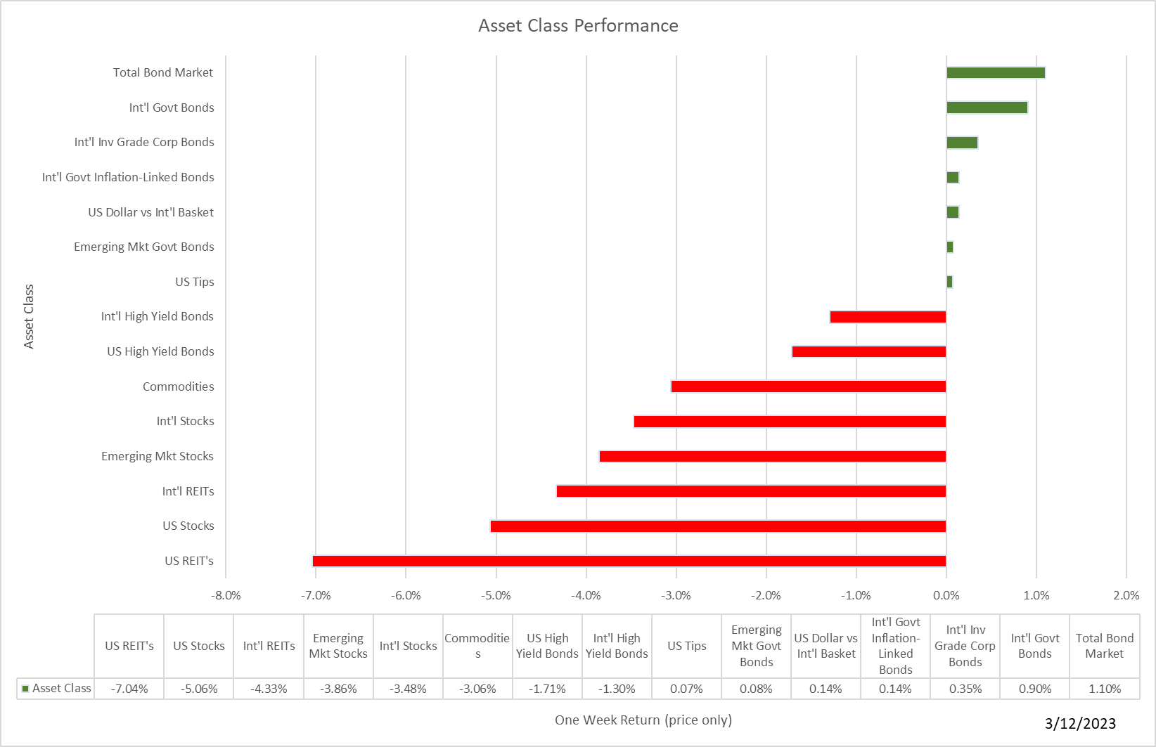 Stocks, commodities, and REITs suffered sharp declines while most bonds benefitted from a flight to safety.