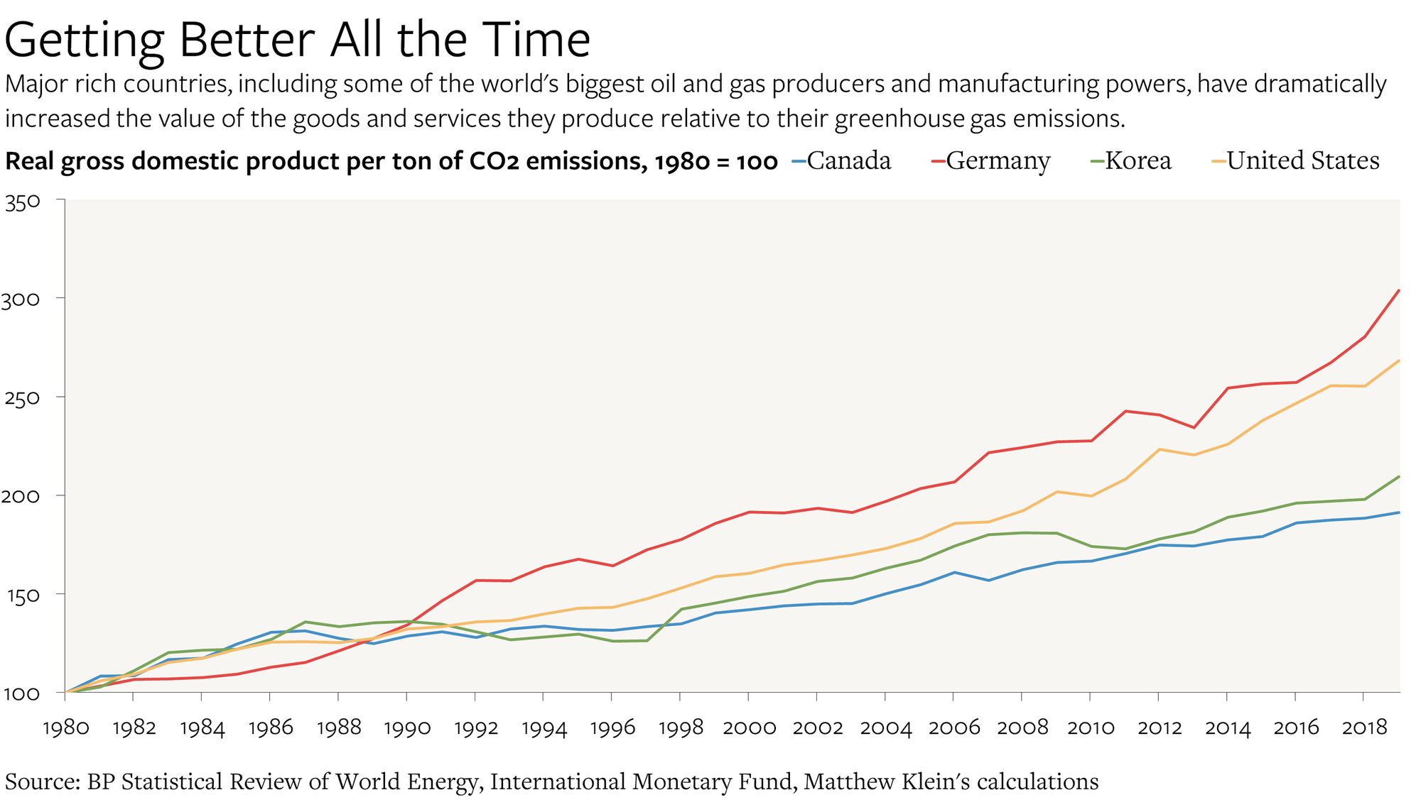 Here's a chart from The Overshoot on the amount of GDP per ton of CO2 emitted. The good news, in my view, is the increasing CO2 efficiency of the major economies suggesting that modern, growing economies are part of the global warming solution, not part of the problem.