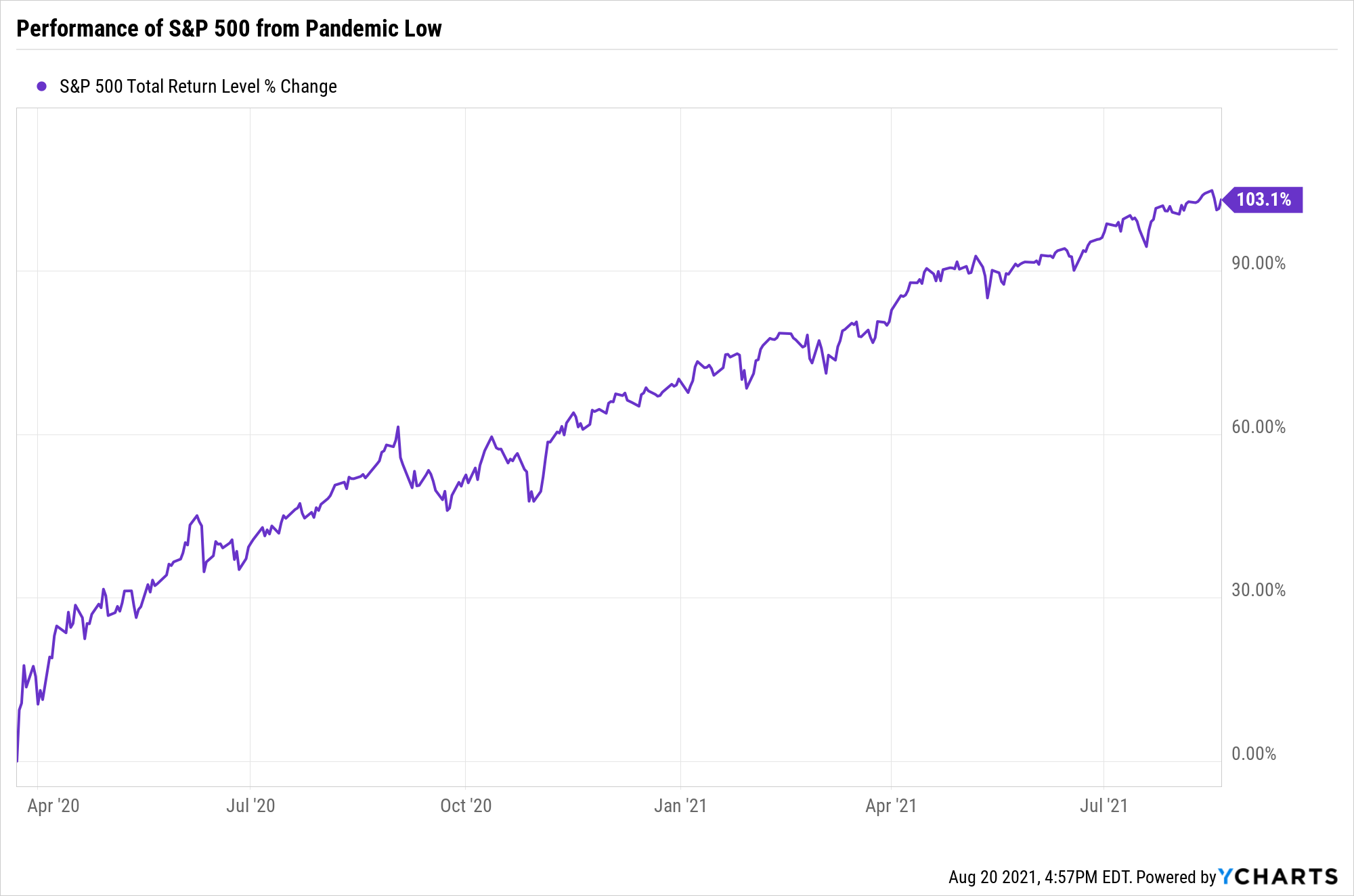 "S&P 500 doubles from its pandemic bottom, marking the fastest bull market rally since WWII" proclaimed the CNBC headline on August 16. Well, it's true. Here's the chart showing the S&P 500 rising over 100% since March 23, 2020.