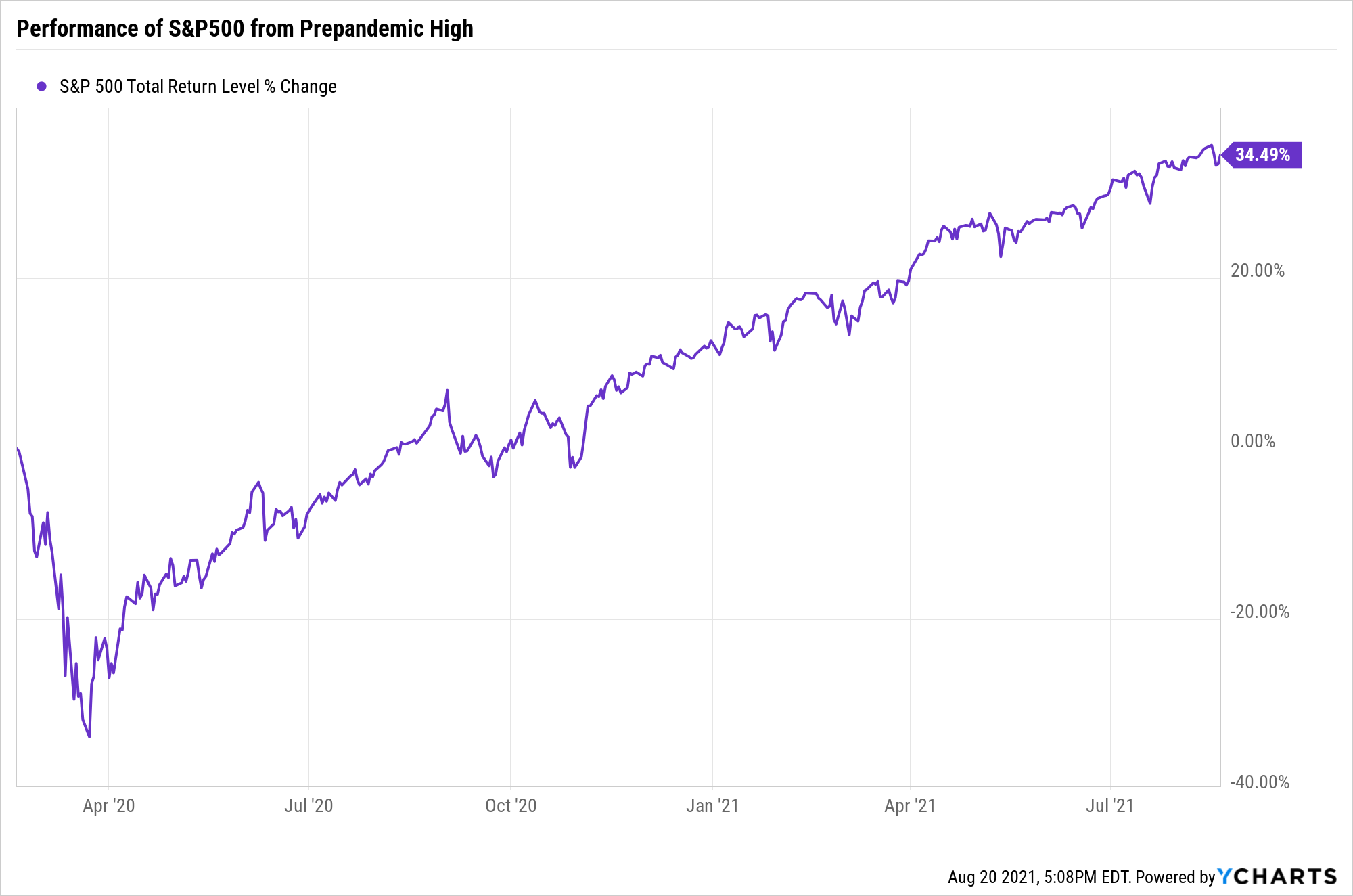 But wait, didn't stocks take a tumble as COVID-19 began its spread around the globe? They sure did, falling 33.8% between February 19, 2020 (the all-time high up to that point) and March 23, 2020! So let's look at the same chart but with a starting date of February 19, 2020: