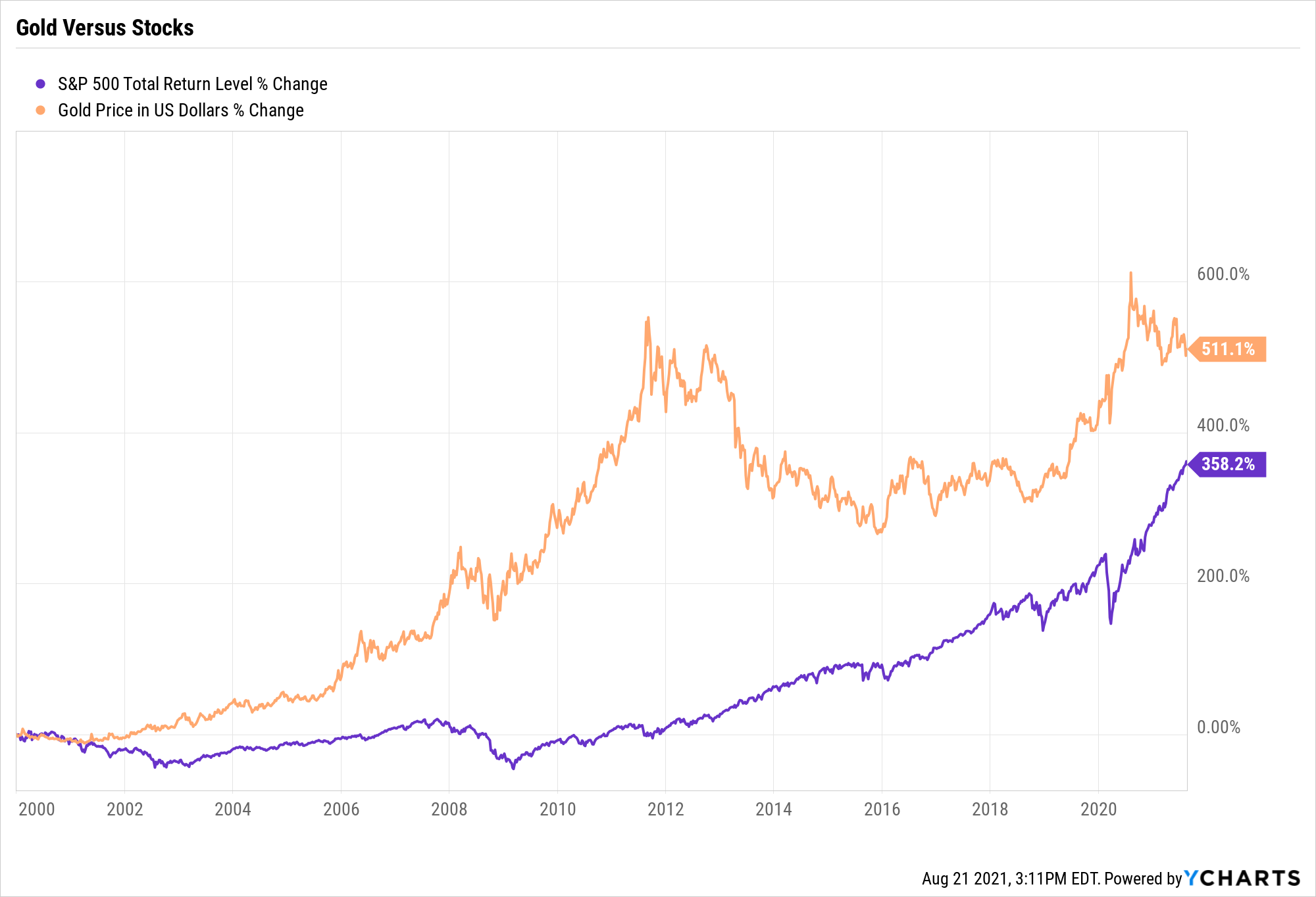 You would be (significantly) better off, even on a total return basis, if you owned gold instead of stocks since the turn of the century. Going forward, who knows?