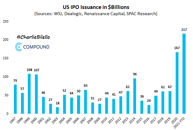 Perhaps. Here are some charts from Charlie Bilello at Compound Advisors regarding IPO issuance. The number of initial public offerings (including SPAC's) is soaring, well above the levels we saw just before the market collapsed in 2000/2001. Here's the chart: