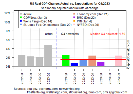 It looks like fourth-quarter GDP growth slowed markedly in the final quarter of 2023. Here is The Capital Spectator's latest survey of GDP nowcasts which suggests growth will be somewhere in the 1.5-2.0% range.