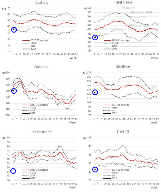 I saw this set of charts in a recent Daily Shot Brief describing the inventory situation for crude oil as well as gasoline, distillate, etc. What it shows in every case is that inventories are starting the year at or below one standard deviation from the average of the past five years. This tight inventory situation suggests oil prices are likely to remain high or move even higher as demand continues to recover. It also leaves us more vulnerable to unexpected demand or supply shocks.