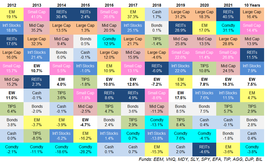 Every year Callan LLC, a leading pension consultant, produces the Periodic Table of Investment Returns which ranks major asset classes by annual returns and displays the results over a number of years. Here is a link to the Callan 2022 Period Table of Investment Returns.