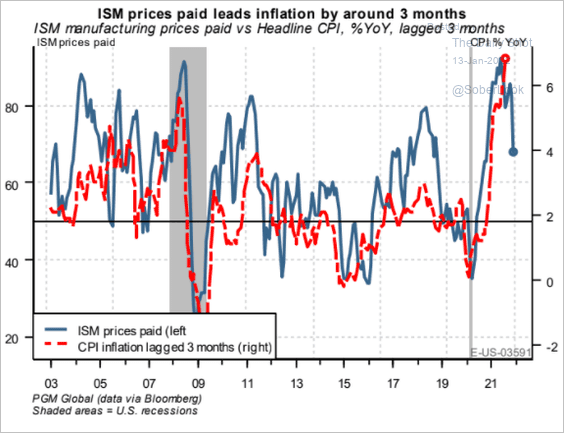 But perhaps there's some good news on the inflation front. The Institute for Supply Chain (ISM) prices paid index has fallen quite sharply from its peak (the blue line). This index tends to lead consumer prices by about three months suggesting CPI (red line) may be peaking soon. Here's the graph: