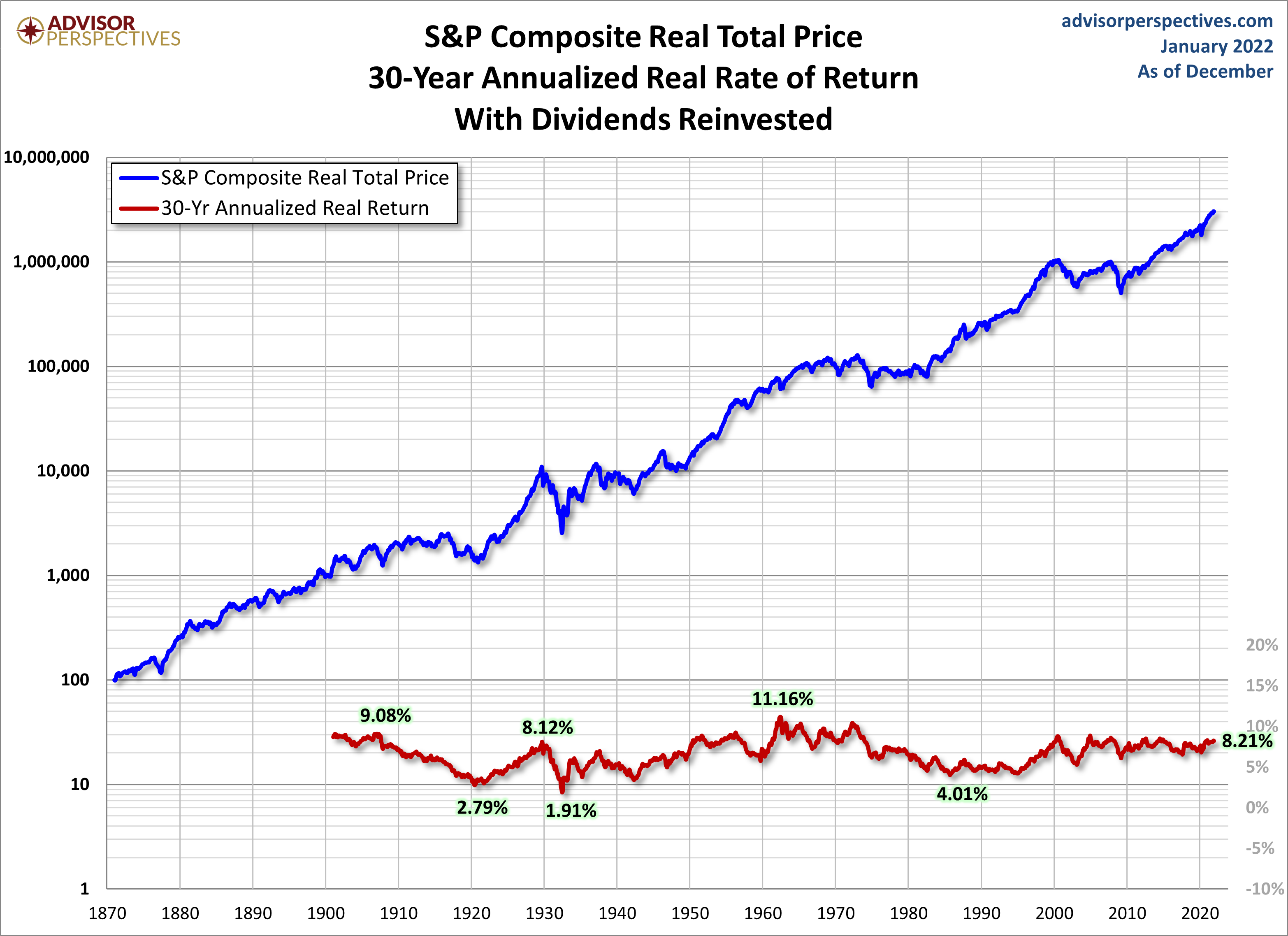 Notice these 30-year returns are positive - always. Even during the great depression of the 1930s. Of late, the returns appear to have been quite stable, finishing 2021 at 8.21%.