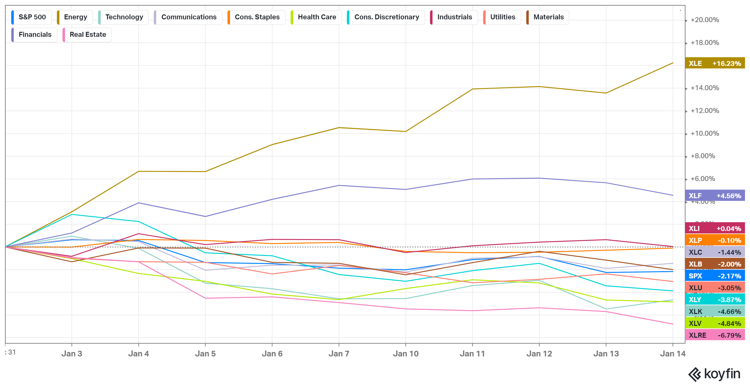 The first couple of weeks of 2022 haven't been the most pleasant for investors with the major indexes posting losses so far this year. Take a look at this somewhat hard-to-read chart of the eleven sectors that make up the S&P 500. Only two, energy (XLE +16.2%!) and financials (XLF +4.6%), have posted positive returns so far. Three sectors, technology (XLK -4.7%), health care (XLV -4.8%), and real estate (XLRE -6.8%) have faired the worst compared to the S&P 500's -2.2% performance.