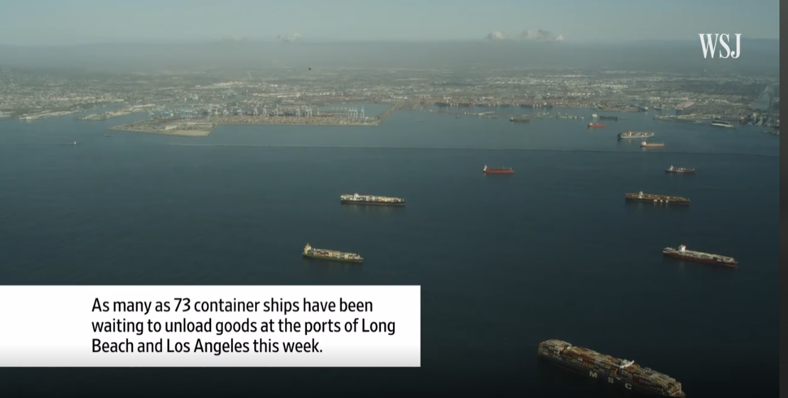 As you know, the supply chain has been a growing problem since the pandemic began in 2020. A significant part of the disruption is the backup at Southern California ports. If you click on the picture below, you'll get a sense of the size and scope of the problem. (The full video from the Wall Street Journal is about 5 minutes in length.)
