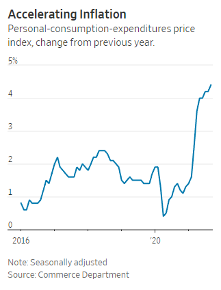 The Personal Consumption Expenditures Price Index increased 4.4% in September from the prior year, the fastest increase since 1991. The monthly change was 0.3% or 3.6% annualized suggesting an easing of inflationary pressures. This is one of the Fed's favorite inflation measures.
