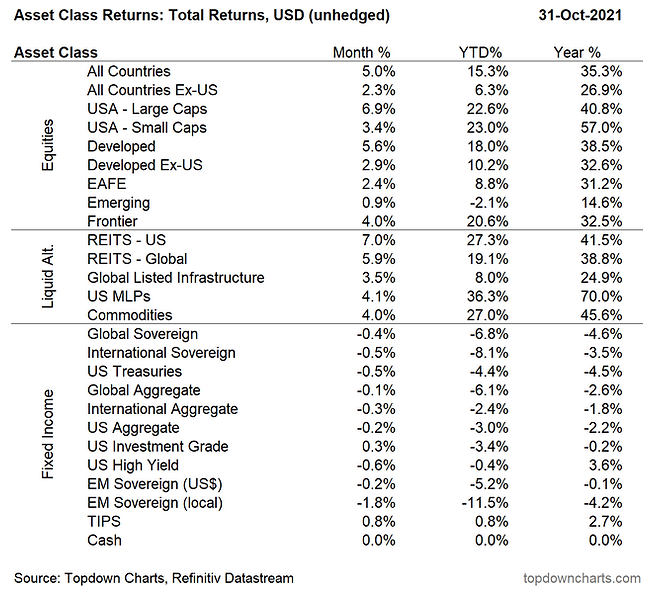 This table from topdowncharts.com shows just how good October was for equity investors. Bonds? That's another story...