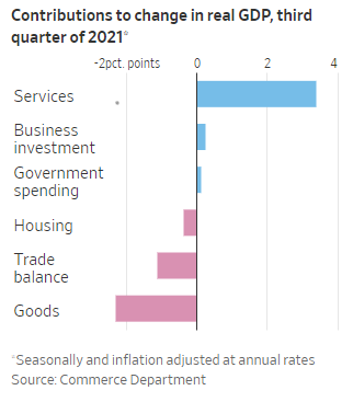Third-quarter real GDP was reported this week. While not as bad as the Atlanta Fed's GDPNow forecast (discussed last week), the 2.0% gain was less than most forecasters had expected. It was the slowest pace of growth since the recovery began. Services were the primary driver of growth while goods actually contracted in the quarter. Here's the breakdown: